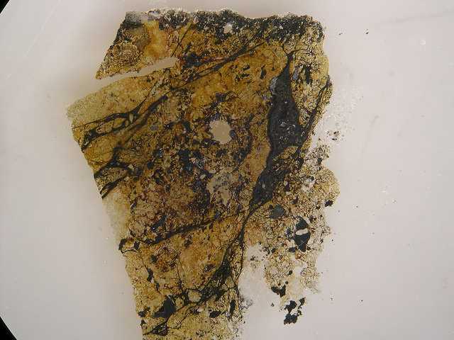 A section of meteorite that landed in Australia in 1879. Bridgmanite was formed and trapped in the dark veins from the intense, quick shock of asteroid collisions. Image credit: Tschauneret et al, Science (2014).[/caption]