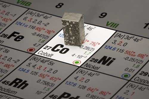 Cobalt (Co) is a bluish-gray, shiny, brittle metallic element. It has magnetic properties similar to iron. There are no significant minerals of cobalt. It is rare and obtained mostly through refining of nickel ore. It is used in super alloys for jet engines, chemicals magnets, and cemented carbides for cutting tools. Principal cobalt-producing countries include Democratic Republic of the Congo, Zambia, Canada, Cuba, Australia and Russia. The United States consumes about one-third of total world production. Cobalt resources in the United States are low grade and production from these deposits is usually not economically feasible.