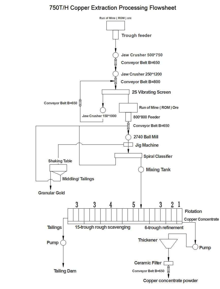 Copper Extraction Process plant includes Jaw crushers, conveyor belt, vibrating screen, ball mill, jig machine, spiral classifier, mixing tank, shaking table, flotation machine, slurry pump, ceramic filter, dewatering screen, tailings dewatering.