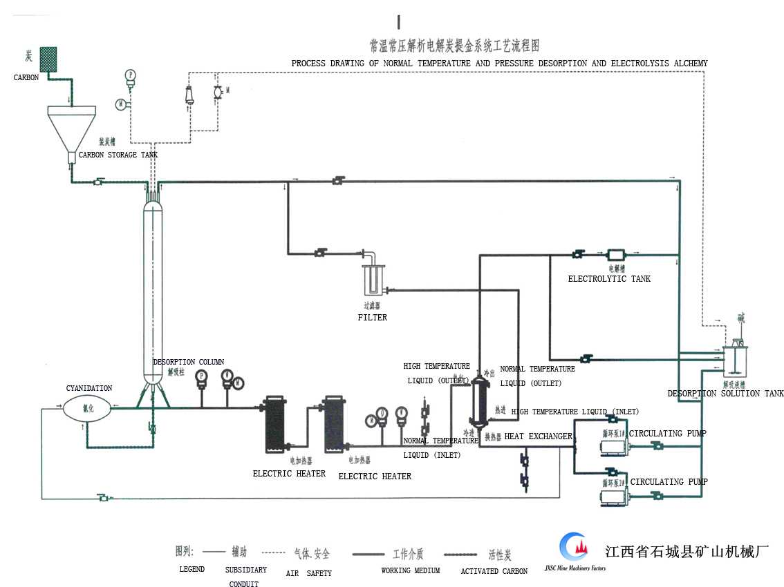 The high-temperature medium-pressure desorption electrolysis process of gold-loaded carbon, that is, the whole system pressure desorption electrolysis process was developed by Australian COMO ENGINEERS in the late 1980s. The gold-loaded desorption electrolysis process is at 150 ° C, 0.5 Mpa pressure. Desorbing and electrolysis at the same temperature and pressure, without using the toxic agent sodium cyanide, and the desorption time is only 8h; plus preheating and loading and unloading time, the gold and silver electrolysis time is about 10 12h than the atmospheric pressure desorption isotherm electrolysis process The saving time is about 50%. The cost of desorption and electrolysis of gold-loaded carbon is not lower than that of normal pressure desorption electrolysis without using sodium cyanide. Due to the above advantages, the whole system pressure desorption electrolysis process has been widely used in many mines at home and abroad. The disadvantages are large equipment investment, strict operation requirements, and troublesome maintenance and maintenance of pressure vessels.