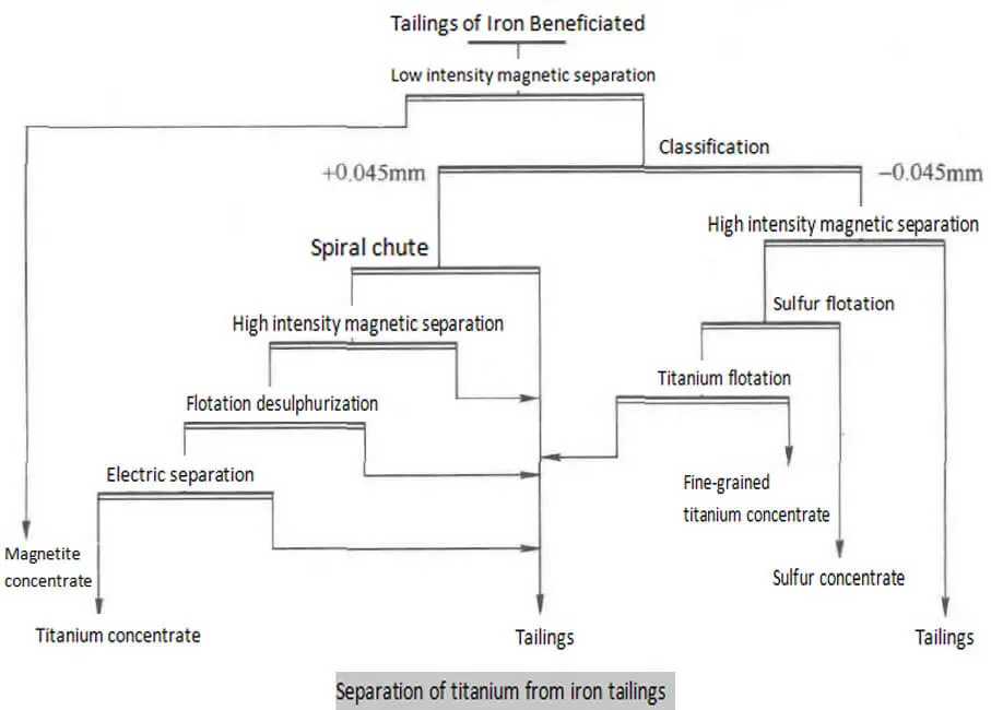 The beneficiation process of titanium depends on the nature of the material. Because the density of titanium ore is larger than that of gangue minerals, it can be used for pretreatment or rough selection tailing; magnetic separation method is widely used in the concentrate separation of titanium-containing minerals; when coarse concentrate contains ilmenite, rutile and non-conductive minerals such as zircon, it can be separated by electric separation; flotation method is used for sorting of primary titanium ore, especially for sorting fine-grained titanium ore.