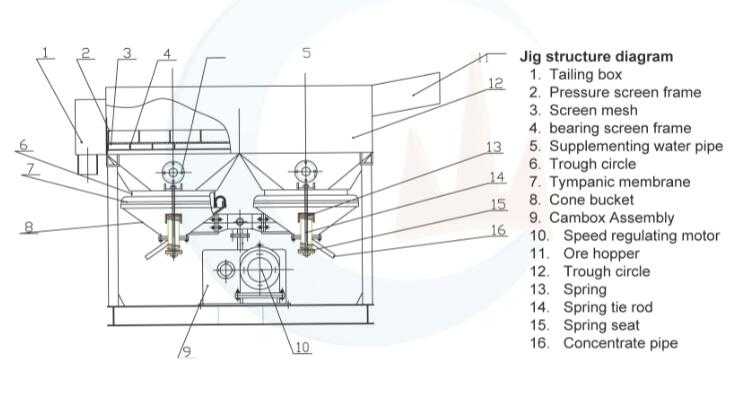 Main parts: Rubber diaphragm, rocker arm, water separator, transmission device, connecting rod, storage bucket, jig room, frame, diaphragm room, ore discharging stopcock, etc.